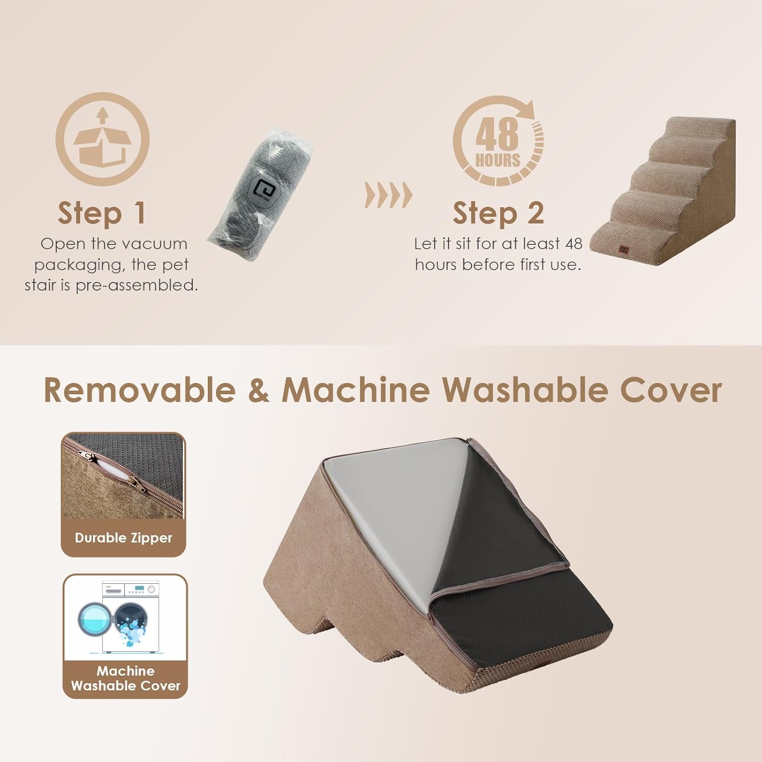 - COMFORTABLE PET STAIRS - This foam dog stair is designed directly against the edge of a bed, sofa or other furniture, so your pet can climb up and down comfortably.