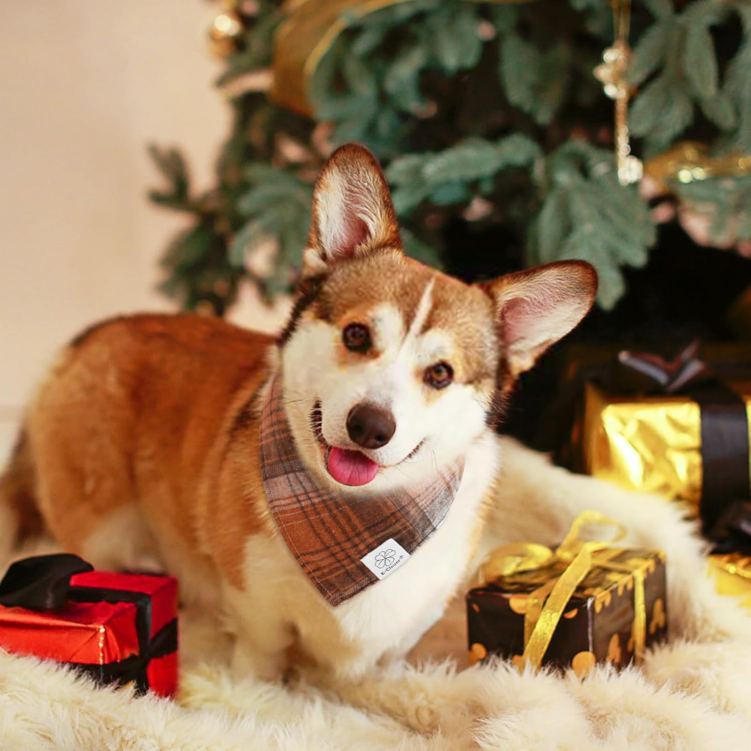 E-Clover Brown Plaid Dog Bandana & Matching Scrunchie-Fall Dog Bandana Triangle Plaid Pet Scarf Bib for Small Dogs Puppy Girl Boy Owner Gift
