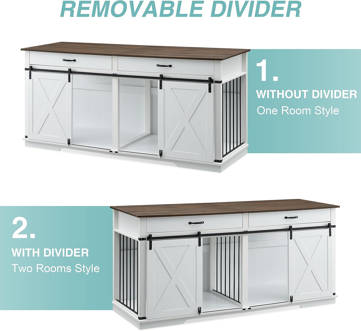 EDYO LIVING 72.5" Large Dog Crate Furniture for 2 Dogs, Wooden Dog Kennel with Drawers, Divider, Sliding Barn Door, Water Resistant Indoor Furniture Style Double Dog Crates, White