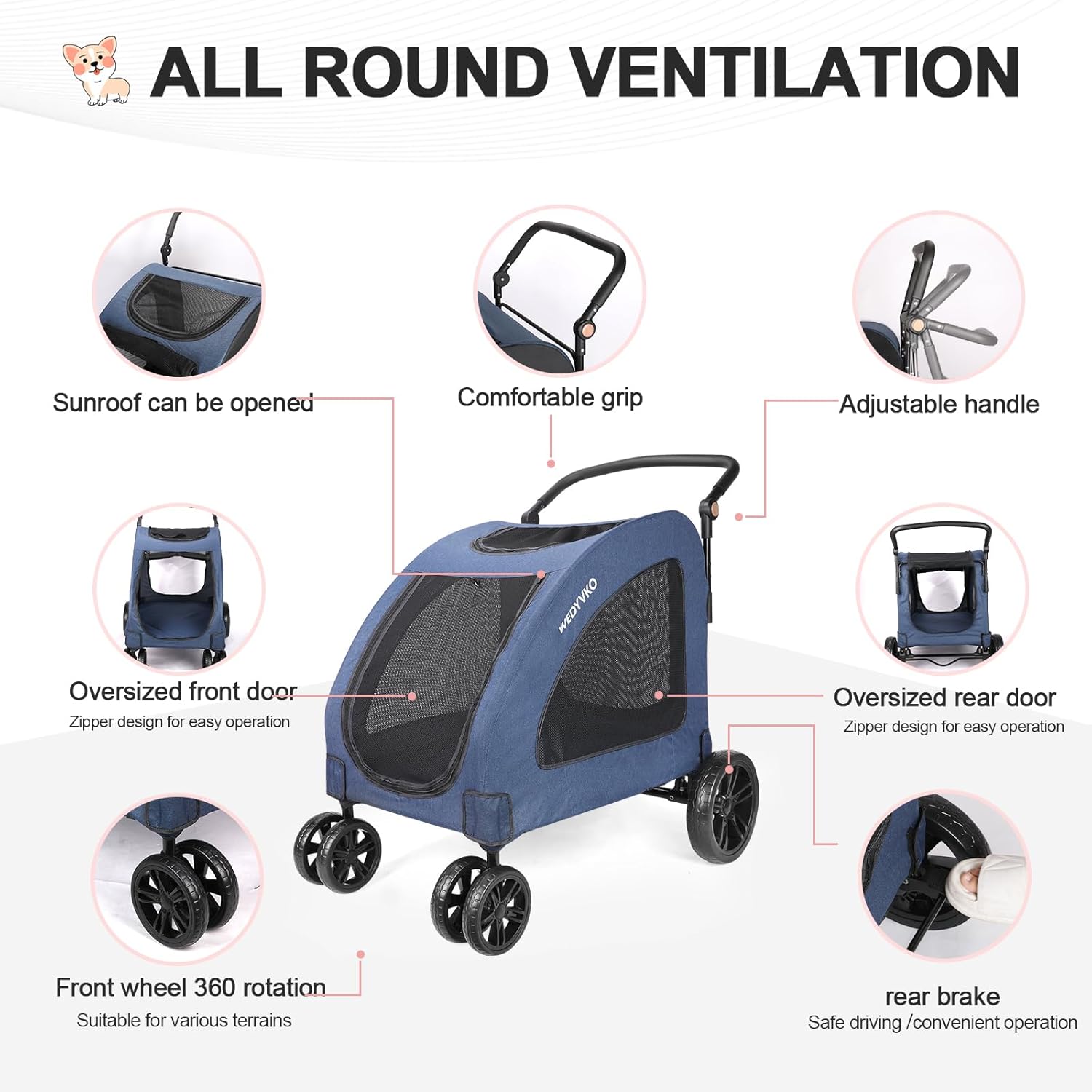 Large Dog Travel Stroller with 4 Heavy Duty Wheels Pet Stroller with Adjustable Handle - Double Doggie Capacity Jogger Wagon with Back Front Door for Small Medium Large Dogs (Navy)