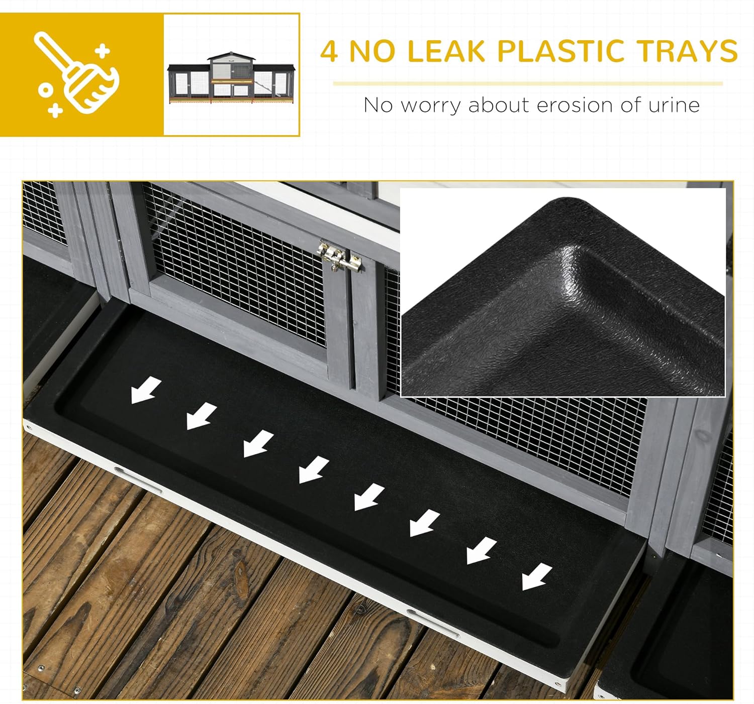 - Easy to Clean: The main house and each run box of this rabbit hutch outdoor have built-in slide-out trays underneath, making cleaning this hutch super-easy.