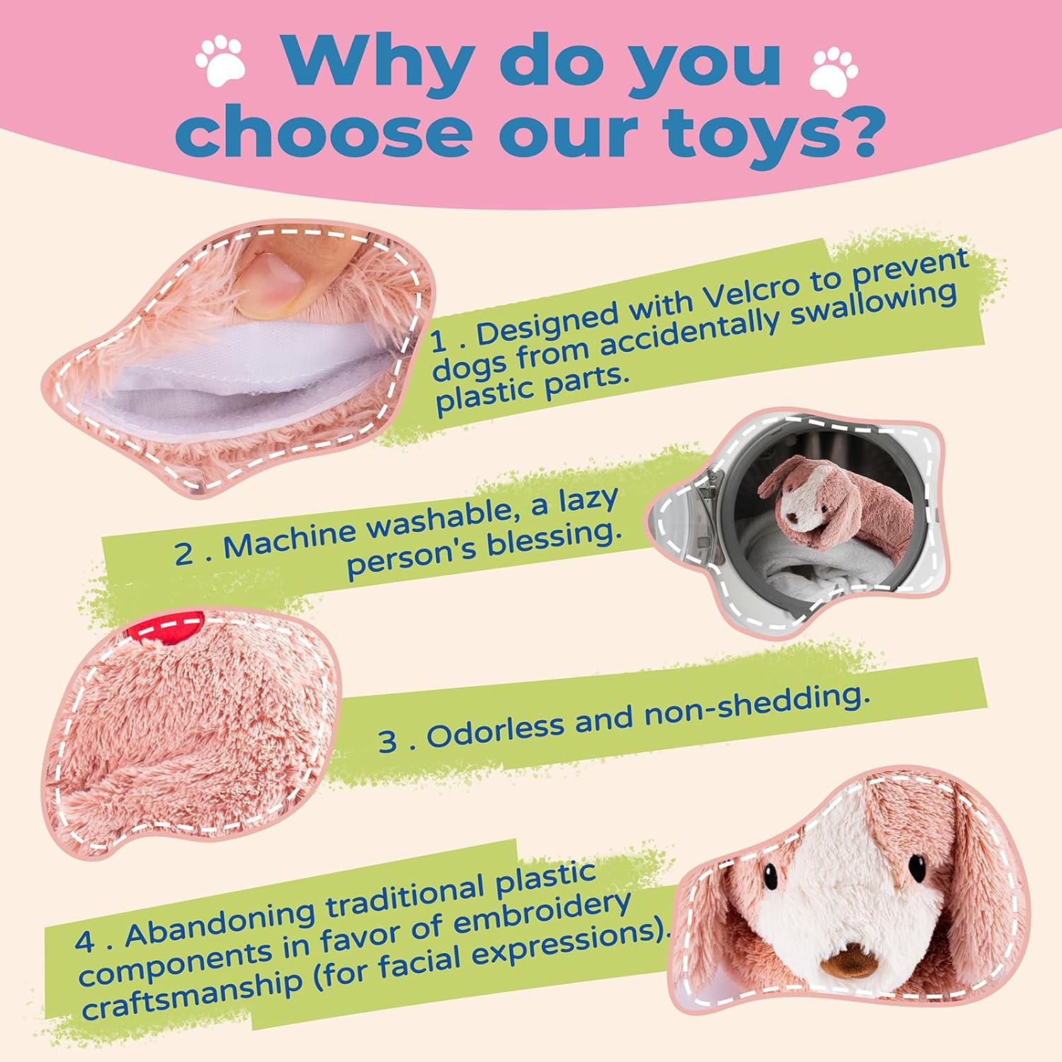 - Plush Toy with Heartbeat: The product contain a cuddly toy and a true heartbeat simulator that need 2 AAA batteries but not included. The Soothing dog toys is made from comfortable, skin-friendly fabrics, and it can be machine washable with the heart removed.