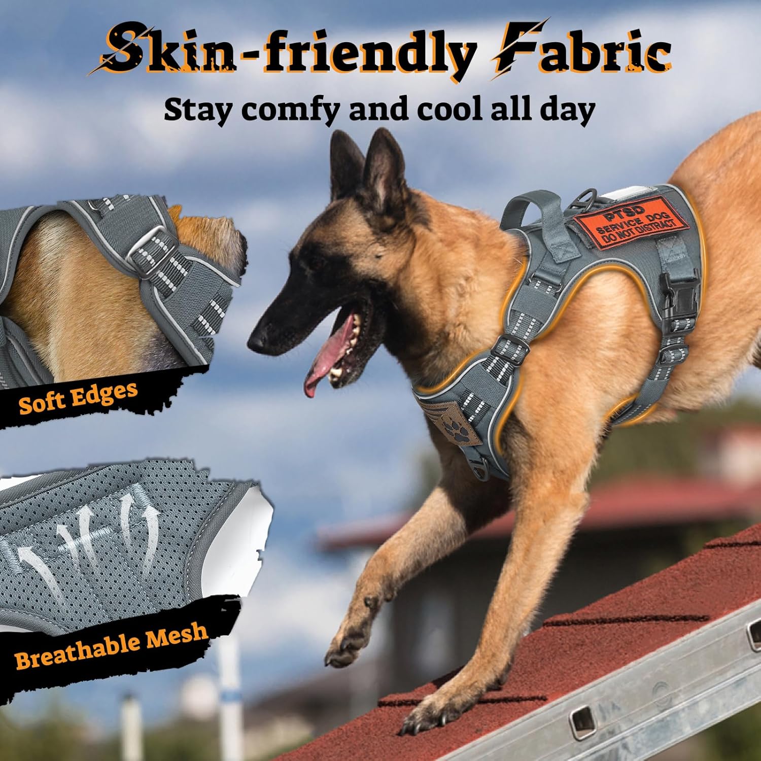 • No-Pull and Control: The harness has 18 leash attachment clips, including a metal front clip for no-pull running and a daily back clip for casual jogging. The large padded handle offers comfortable real-time control in an emergency