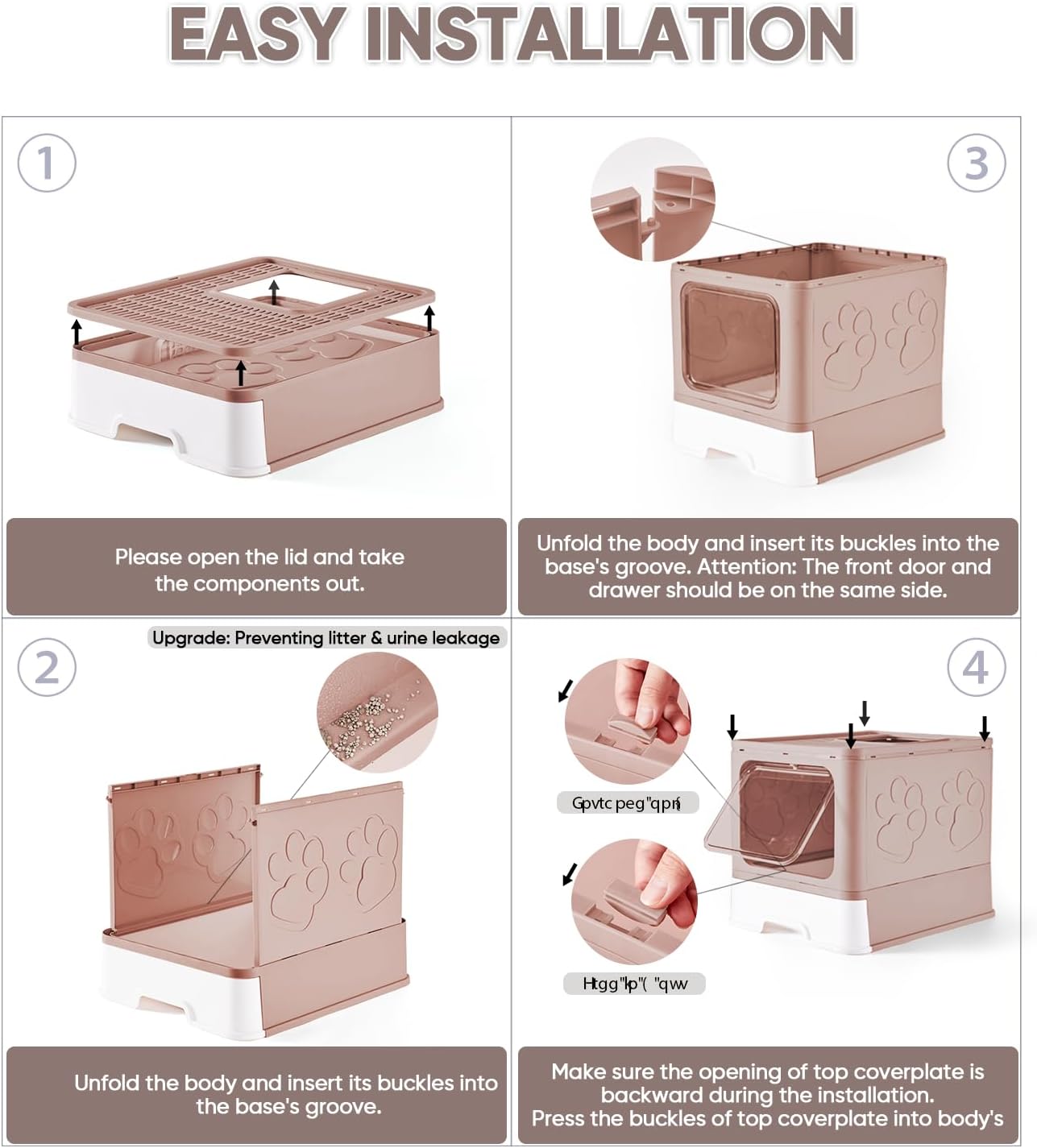 Cat Litter Box with X-Large Litter Mat and Scoop, Large Foldable Litter Box with Lid, Enclosed Kitty Box,Front Top Entry Exit, Odor Control Easy to Clean (Upgrade Coffee)