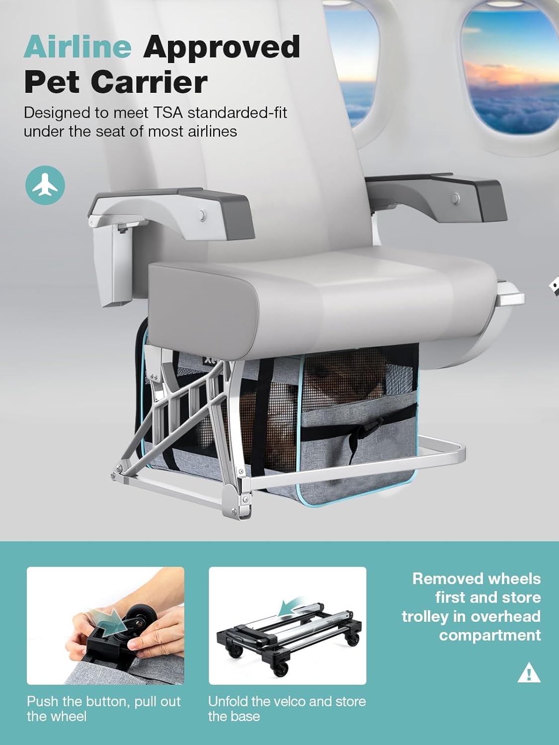 • Pet Carrier Airline Approved: Designed to meet TSA standards, this dog carrier fits under the seat of most airlines when the wheels are removed. Pet carrier size: 16.93''L x 11.81''W x 11.81"H (without wheels). Recommend for pets up to 15lbs.