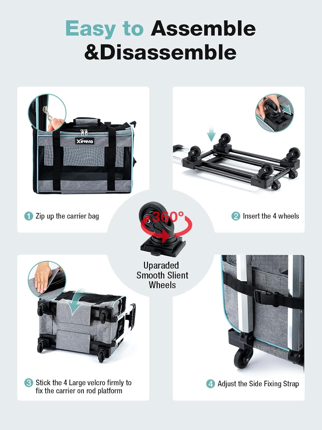 • Easy to Transport: The built-in telescopic trolley handle and easy swivel wheels make it convenient for travelers walking through airports. The rolling cat carrier also features a carrying strap and adjustable shoulder strap for easy pulling and pushing.