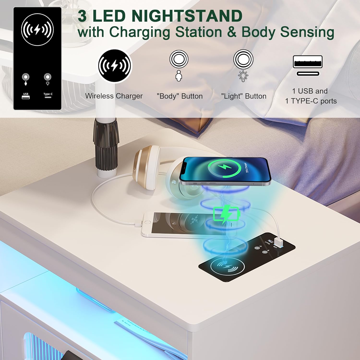 HNEBC Nightstand Set of 2, LED Nightstand with Wireless Charging Station/USB Ports,Smart Nightstand Has Adjustable Rotary Workstation with 2 Drawers,Modern Bedside Table for Bedroom Furniture(White)