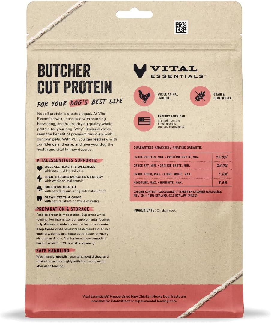 - FREEZE-DRIED RAW CHICKEN NECK DOG TREATS: Vital Essentials Freeze Dried Raw Dog Treats are a high-protein, low calorie treat that can help support your dog's overall health. These treats contain no artificial preservatives or additives. Chicken Neck is the only ingredient.