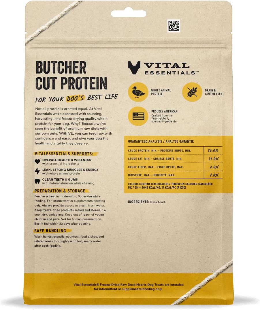 • FREEZE-DRIED RAW DUCK HEART DOG TREATS: Vital Essentials Freeze Dried Raw Dog Treats are a high-protein, low calorie treat that can help support your dog's overall health. These treats contain no artificial preservatives or additives. Duck Heart is the only ingredient.