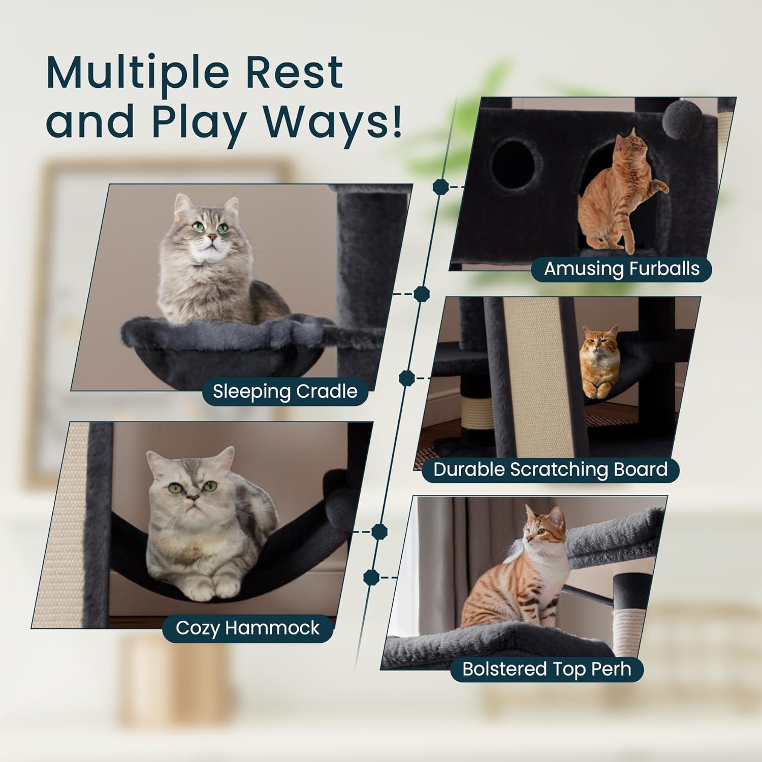 • COMFY HOME FOR ENTERTAINING: A multi-level structure is designed for more than one cat to play at the same time. Padded plush perches provide a cozy place to rest; sisal rope coiled posts and scratching ladders help encourage scratching behavior