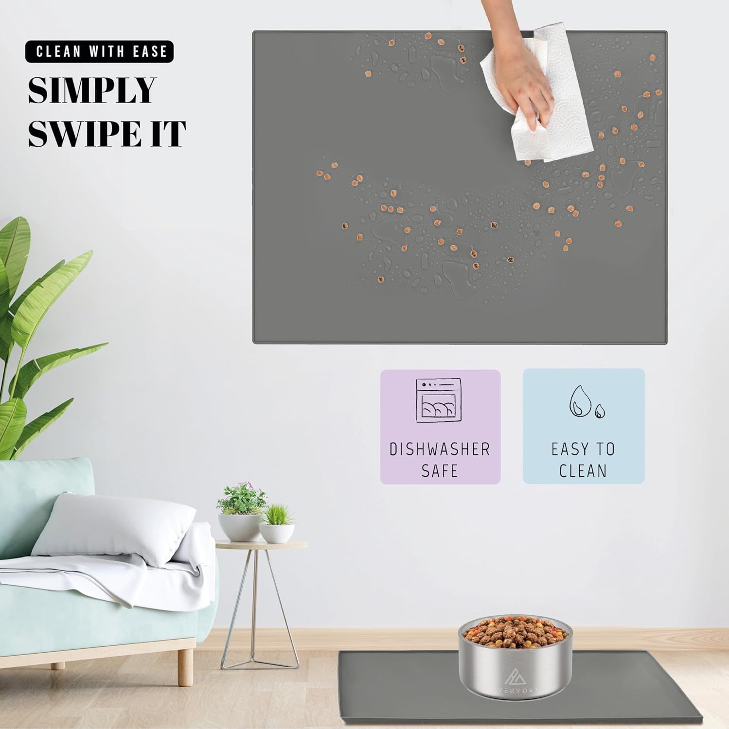 • Non-Slip Design: No more sliding bowls! AVERYDAY's heavy-duty pet mat stop bowls from sliding during meals. The dotted surface boosts slip resistance, ensuring your pets' food and water bowls stay securely in place