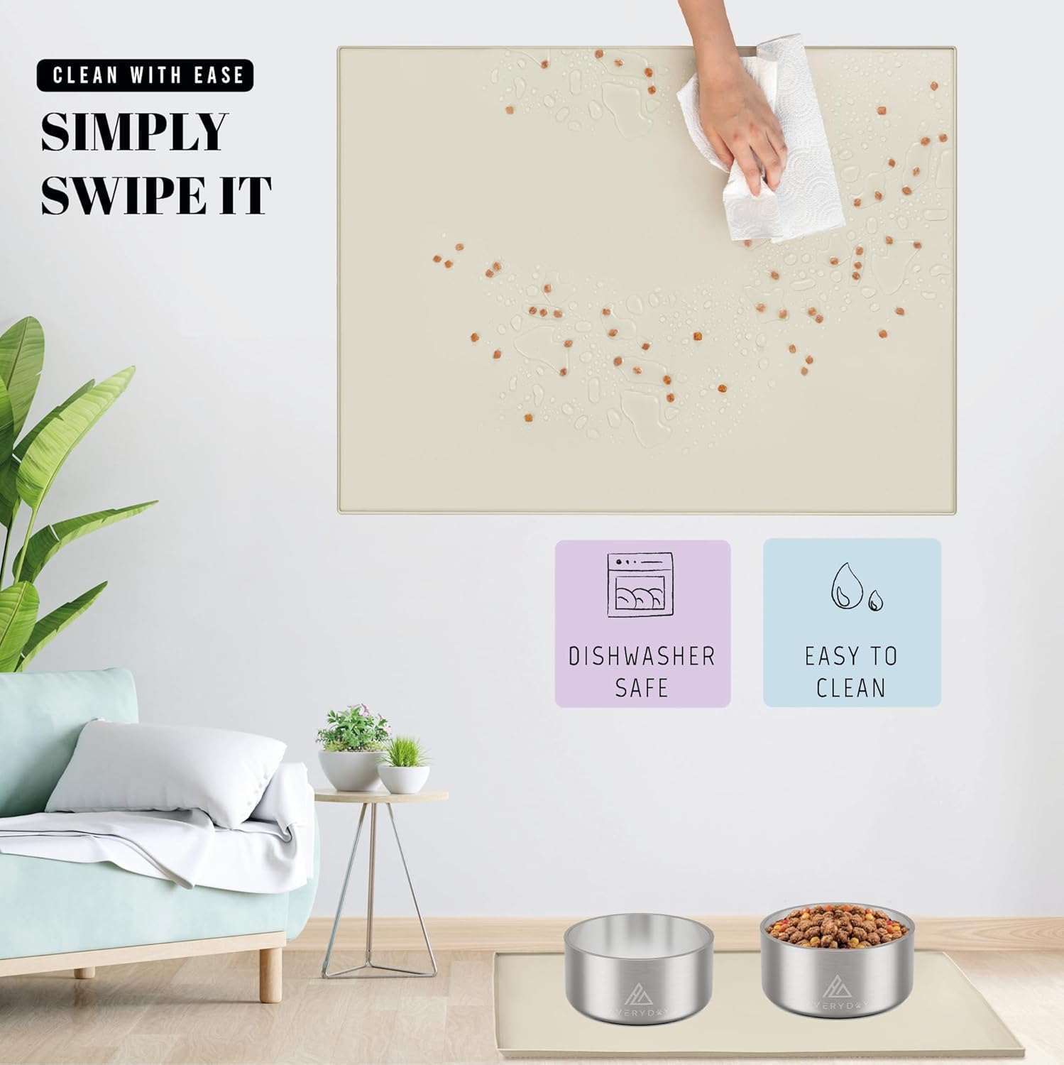 • Non-Slip Design: No more sliding bowls! AVERYDAY's heavy-duty pet mat stop bowls from sliding during meals. The dotted surface boosts slip resistance, ensuring your pets' food and water bowls stay securely in place