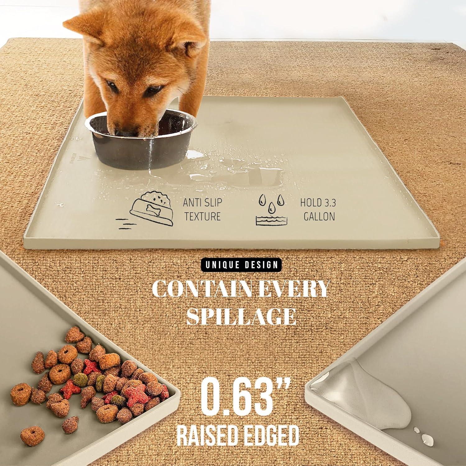 AVERYDAY 23x16'' Silicone Dog Mat for Food and Water, 0.63'' Edge Dog Food Bowl Mats for Floor Waterproof, Dogs Water Mat for Sloppy Drinker, Non Slip Rubber Pet Feeding Mats for Indoor Dogs and Cats