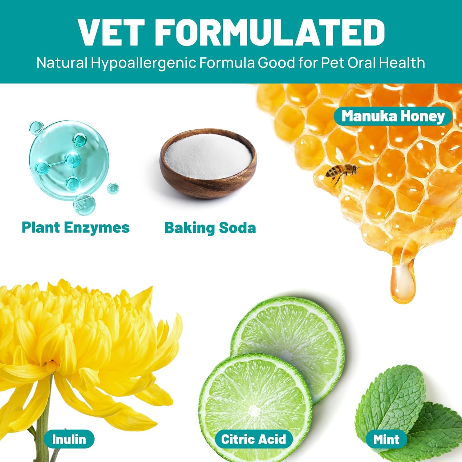 • Vet-Approved Formula: Our pet dental wipes combine natural ingredients to actively support your pet's oral health. Plant Enzymes target and break down plaque biofilm at the source, preventing tartar buildup. Baking Soda neutralizes acids for fresher breath. Manuka Honey calm sensitive gums. Tea Polyphenols inhibit harmful oral substances. It's safe if licked or ingested. Perfect for pets with sensitive gums, weak enamel, or those who resist conventional dental care.