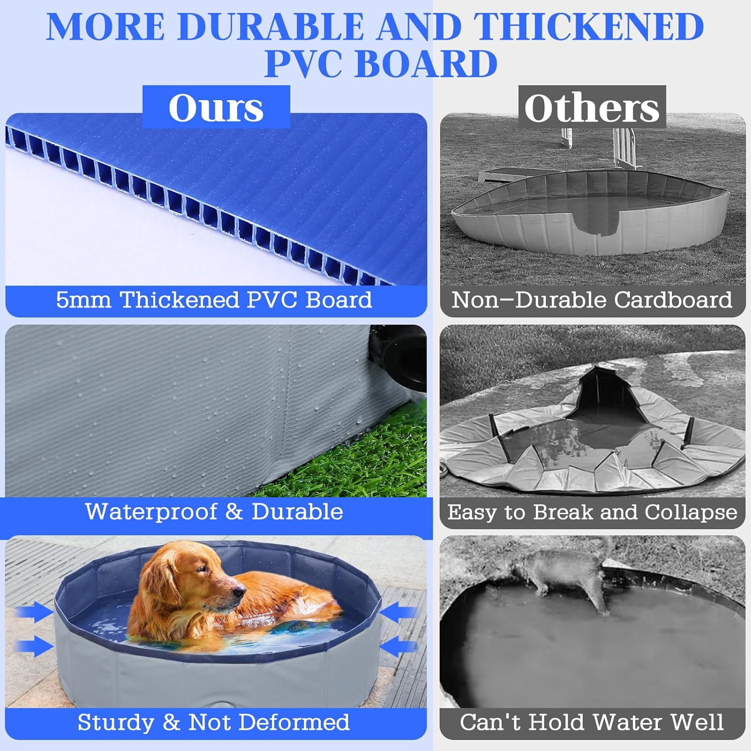 • 【High-quality Material, Sturdy Durable】The dog pool / kids pool is made of high-density fiberboard and high-quality PVC material. Strong enough and uneasy to collapse and deform. The bottom is made of abrasion resistant non-slip textured fabric, non-toxic and waterproof, perfect water retention. It also can prevent your pets from slipping when they jump around in the bath pool. Tips: Please trim your puppy's nails to prevent damage or leakage to the inner wall.