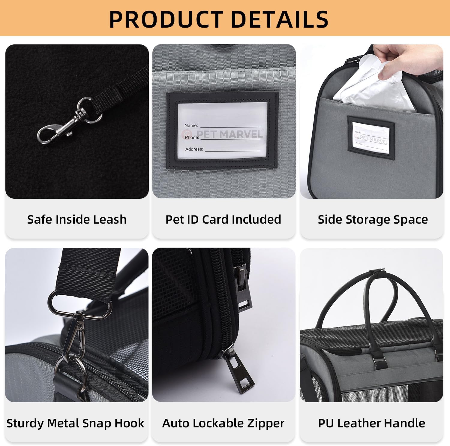 • Thoughtful Features: PET MARVEL cat carriers have 4 mesh windows for ventilation and 3 wide doors that can be opened for easy access. An additional generous side storage pocket collects more stuff like water bottles, snacks and wipes. Equipped with a secure buckle to prevent your pet from escaping.