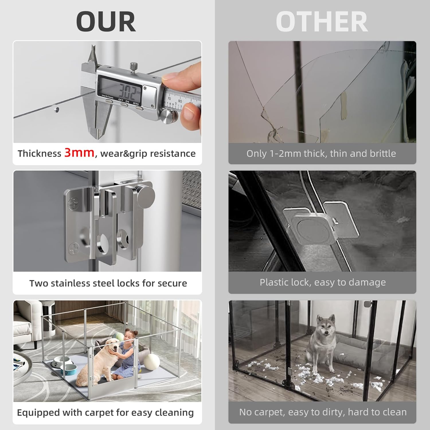• 32"Tall & Innovative Material - Compared to the metal and wood fences,our fence is heighten and lengthen,32"tall and 52"long,also a new innovative acrylic fence design,perfect blend of high-transparency acrylic panel and anti-oxidant aviation aluminum frame for a high class look,offering functionality and style, overall weighs 48lbs with nonslip pad,effectively prevent dogs from jumping out and pushing,large spacious space to keep dog mom and puppies safely contained