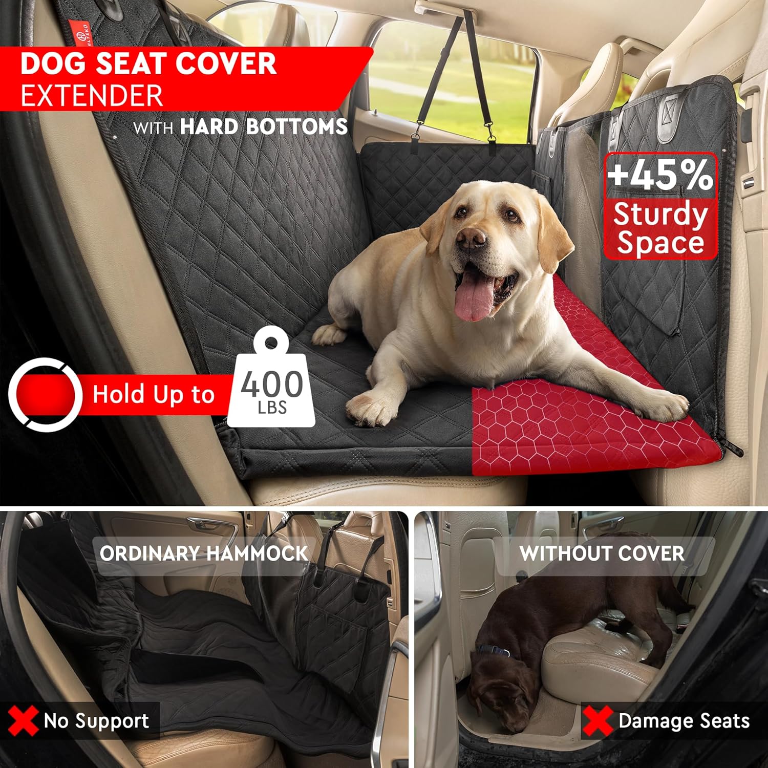 • Hard Bottom & Seat Extension - A hard bottom dog hammock for a car is more sturdy and stable than a soft bottom seat cover and can hold up to 400 pounds. The padded hard bottom has built-in 7-layer protection, and plates made of PP which are more durable than a wood base. The hard bottom cover will extend your bench seats by 45% to create a comfortable place for your pets.