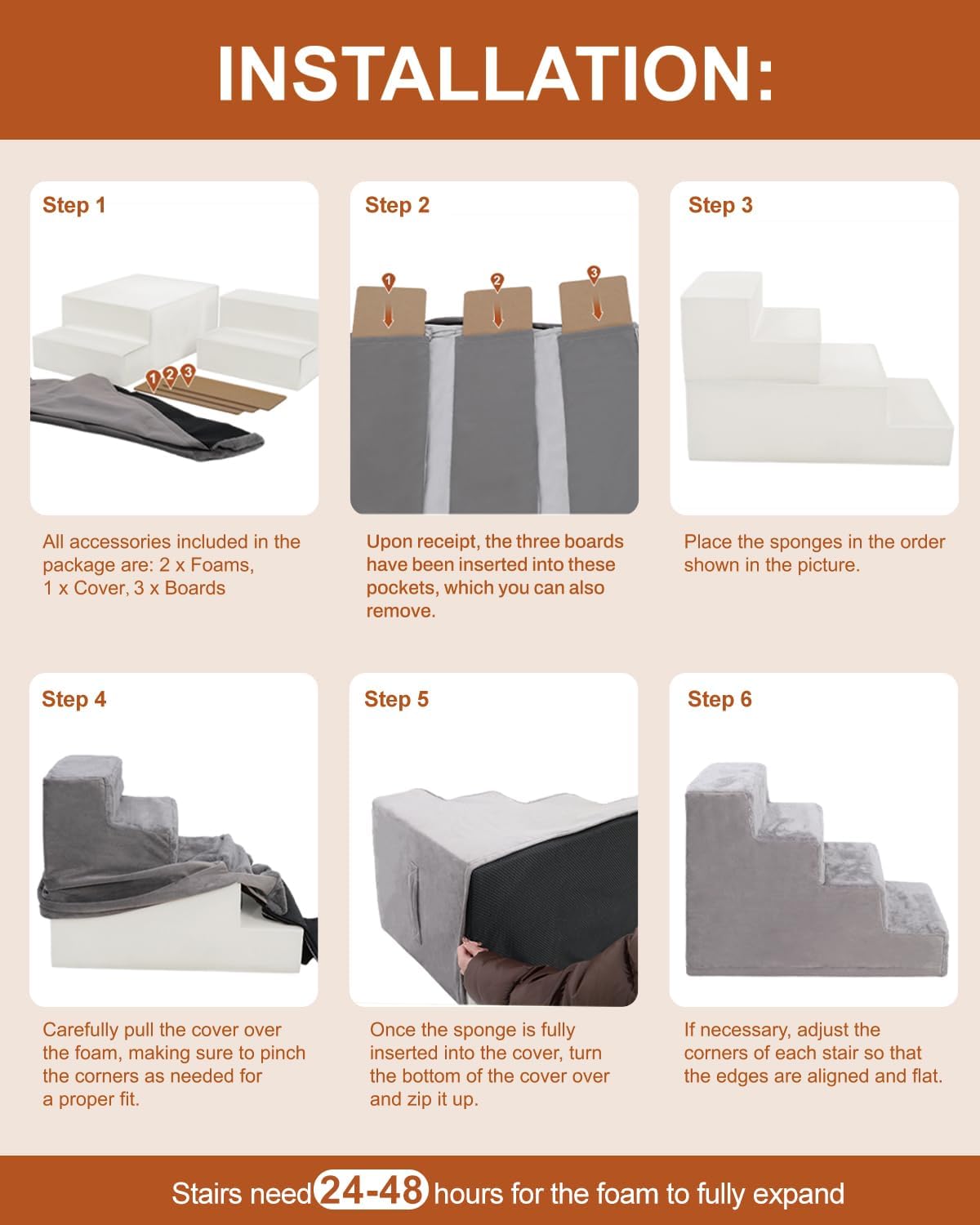 • CARE INSTRUCTION: After being compressed for a long period of time, the sponge may need some time to bounce back. Please allow at least 24 hours for it to fully expand. If you encounter any issues with the dog stairs, please contact us immediately. We will do our best to assist you in finding a solution.