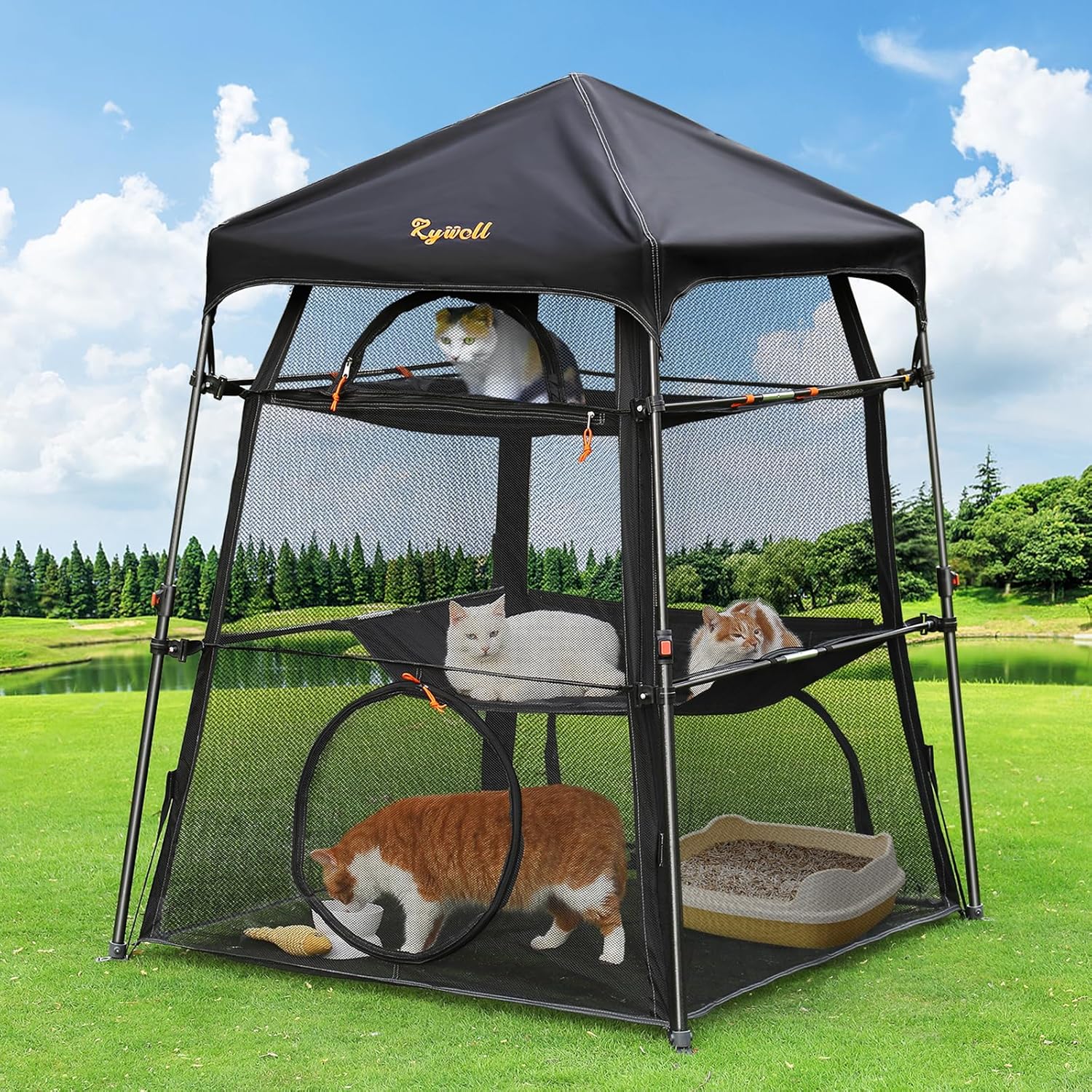 - đ˝ăProvide shade and shelter for catsă Cats love cozy, secure spaces, and the Rywell catio delivers just that. The roof of catio cat enclosure has a waterproof cover to provide pets inside with some protection from light rain or direct sunlight. The cover is also UV resistant, so you donât have to worry about it cracking, peeling, or becoming otherwise damaged from regular sun exposure, while also provides concealment for your cat for added security.