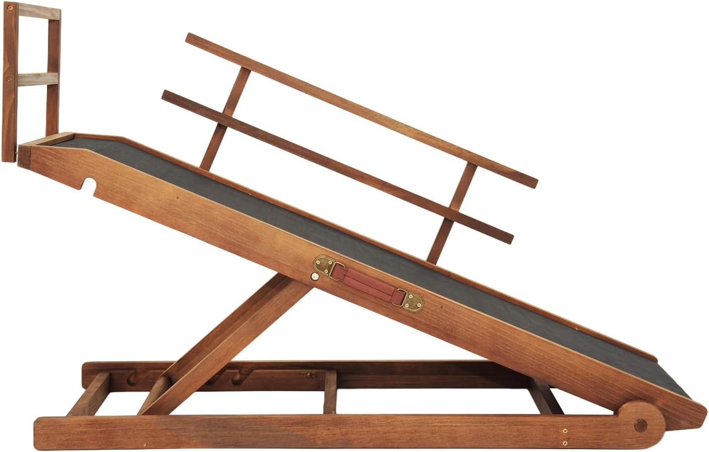 • ☀ Sturdy and Durable: Our pet ramp for dogs and cats crafted with solid wood and reinforced with stainless steel hardware, our ramp is built to support pets up to 210lbs, offering both strength and stability for their safety. If the ramp is slippery for your floorboar. You could put carpet or non slip material under the ramp.