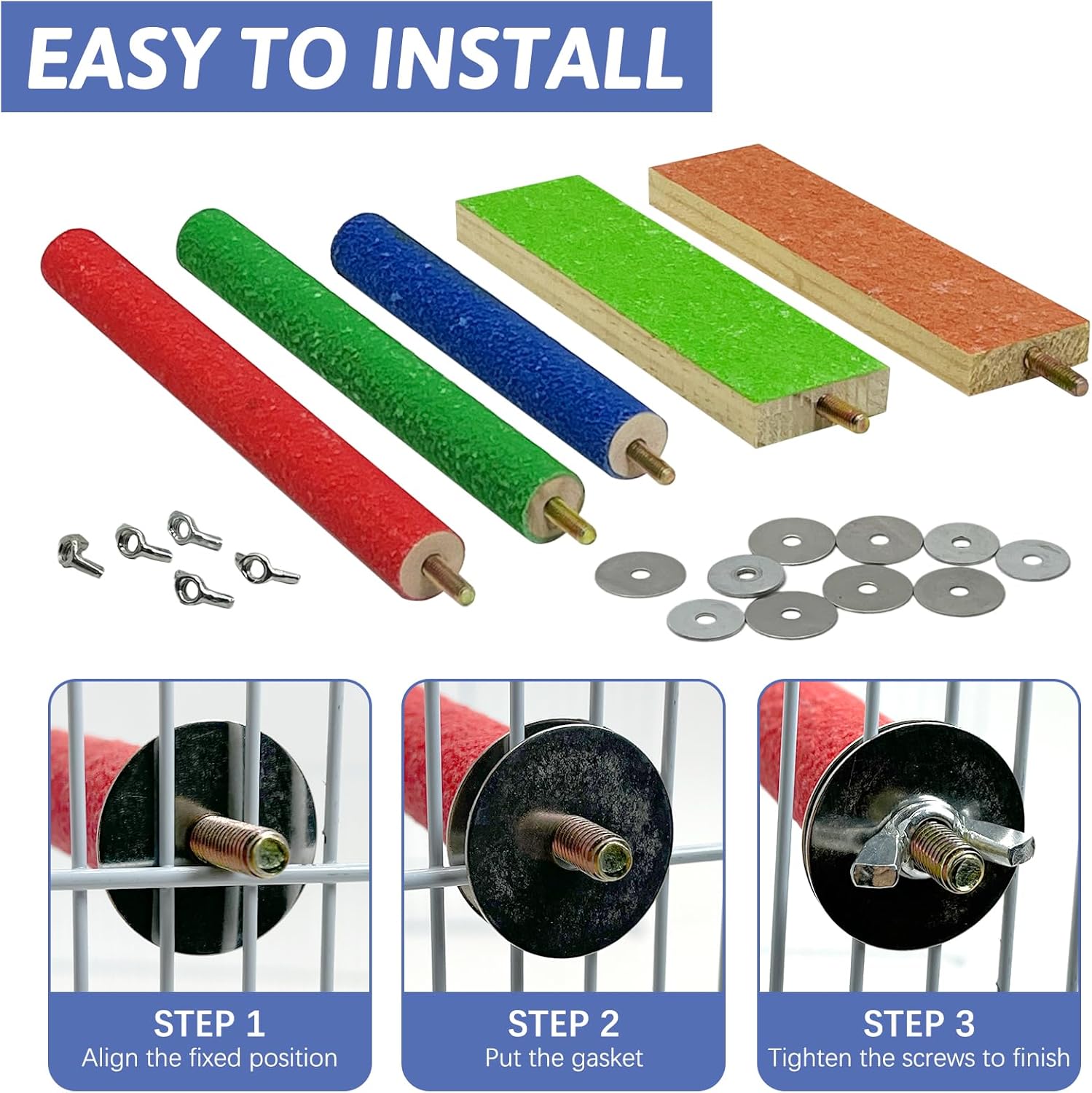 • EASY TO INSTALL : Our colorful bird platform is easy to install, no additional equipment is needed for installation, just loosen the nut of the stand pole, remove the spacer, place the stainless steel screw into the gap between the two wires of the bird cage, install the spacer, and then tighten the stainless steel nut. The flat parrot stand platform is equipped with metal wing nuts, bolts and washers, easy to hang in the cage, not easy to fall, the bird perch can be firmly fixed. Convenient for birds to play freely. It is the best bird toy for parrots