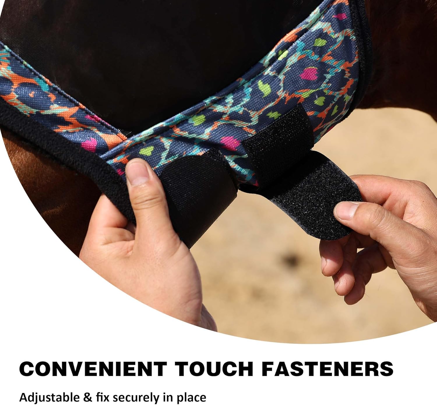 - Lightweight, Multi-Function Fabrics: Ultra-fine, ventilating, and long-lasting nylon mesh offers reliable UV protection for your horse's skin, it effectively prevents sun damage and bleaching. Quality edging along the nose cover enhances durability.