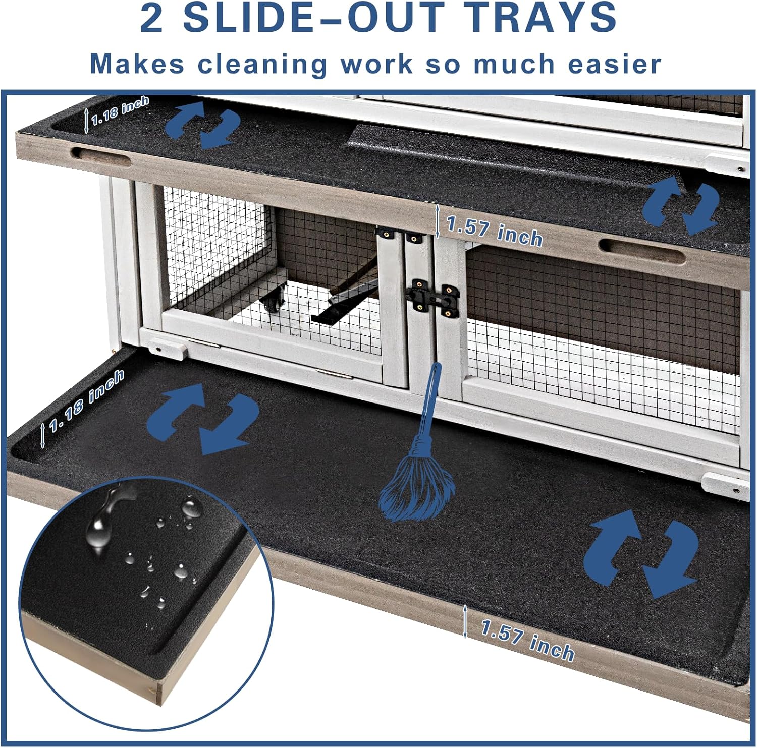 • 🐹【2 PULL OUT TRAYS & EASY TO MOVE】Say goodbye to messy cages and hello to easy maintenance! The bunny hutch is equipped with two deep no-leak trays that simplify cleaning, ensuring a clean and healthy living environment for your pets. Featuring four lockable metal wheels, this rabbit cage is easy to move, allowing you to provide your pets with a change of scenery indoors and outdoors. Whether you want to bring them closer to you or let them enjoy fresh air and sunshine, this cage offers the flexibility you need.