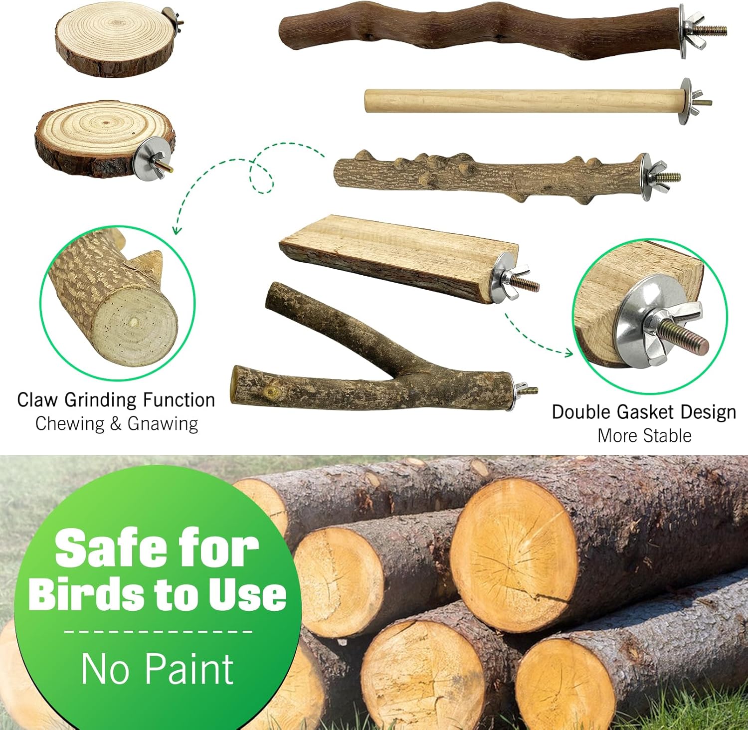 • NATURAL PERCHES: These natural bird perches decorate your bird cage, provide hours of fun for your bird every day, and reduce pet aggression and loneliness. They are suitable for chewing and gnawing, and also for sharpening off your bird's claws and keeping the beak in shape and condition by chewing and gnawing on the perches. These wooden bird perches create a natural habitat for your adorable parrot, making your friends feel as if they are living in nature