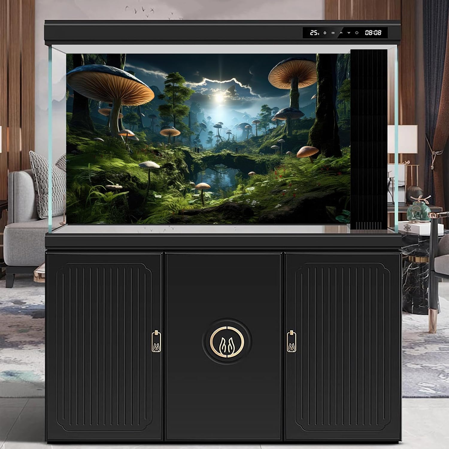 Fantasy Mushrooms Landscape Aquarium Background Tranquil Stream Cloudy Sky Terrarium Background Lush Green Tropical Plants Trees Fish Tank Backdrop Decoration Tank Background Poster 36x18in