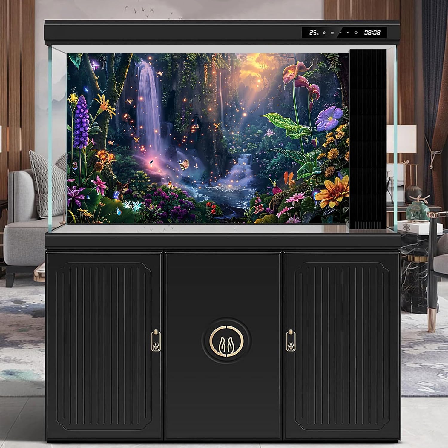 Fantasy Garden Aquarium Background Sunset Waterfall and Flowers Terrarium Backdrop Tropical Forest Lush Plant Magic Butterfly Lights Flowers Fish Tank Background Poster Decorations 48x20in