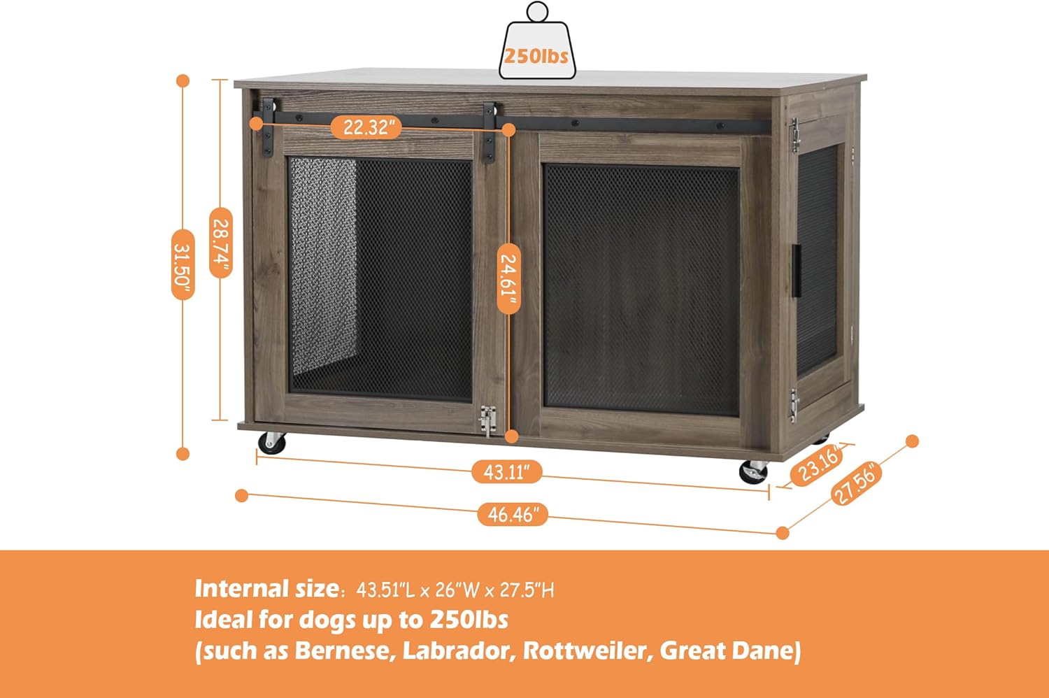 • 【Modern Dog Kennel】Modern Grey Dog crate furniture with sliding barn doors, suitable for any home decoration style. 5 wheels at the bottom, 2 can be fixed and can be moved anywhere you want