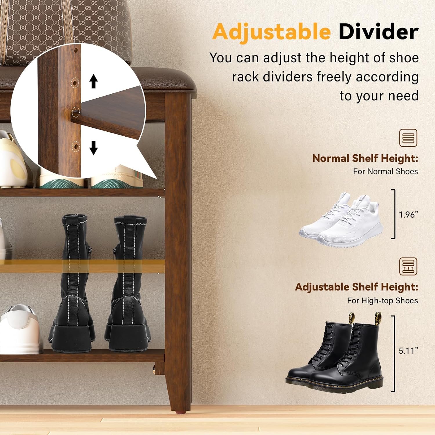 - ADJUSTABLE & REMOVABLE 3 TIERS: The 3-tier design provides ample space to neatly organize and store shoes, keeping your entryway clutter-free. Each shelf is adjustable, typically accommodating up to 4 pairs of shoes. The smaller shelf is suitable for fewer shoes, while the larger shelf offers more storage. All three shelves feature adjustable spacing, allowing you to use two shelves to accommodate taller shoes or store other items easily.