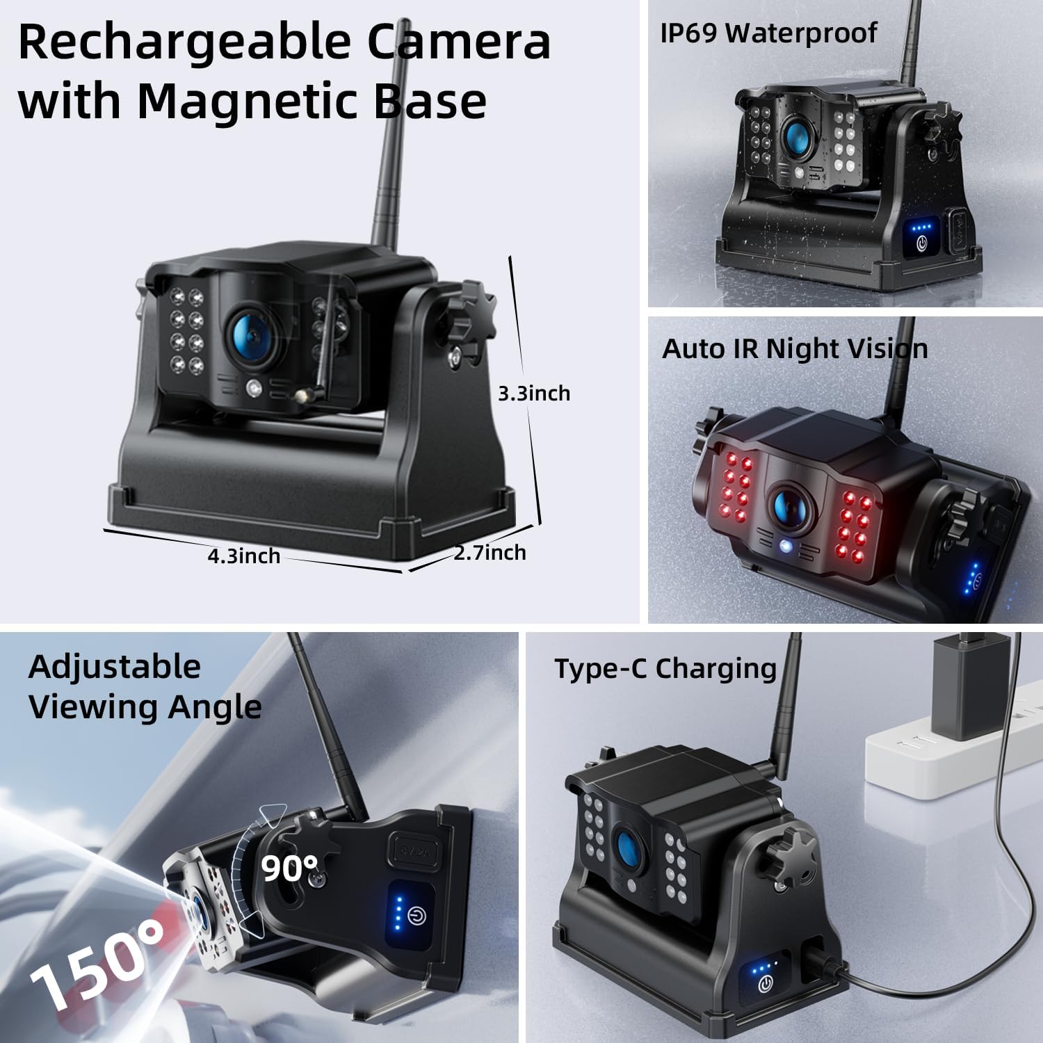 • 1-Min DIY Installation : With a strong magnetic base and buit-in battery, this wireless backup camera can effortlessly adhere to any metallic surface without the need for drilling holes or routing wires on your vehicle. It offers true plug-and-play functionality, allowing for installation in just one minute. The magnetic base and battery design also facilitate convenient removal and reinstallation of the wireless reverse camera on alternative vehicles or locations.