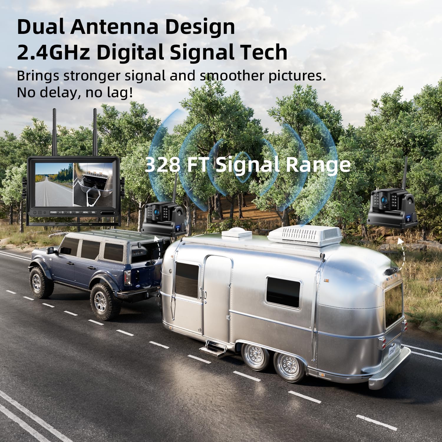 • Dual-antenna & 2.4GHZ Wireless Signal : Utilizing advanced 2.4GHz wireless signal technology and dual antenna design, it provides a more reliable and stable signal with no delay and no lag in images. With a reception range of up to 200ft in the open, it shows you your surroundings in real time, even at high speeds of 102 mph.Suits for car/SUV/camper/truck/voyager RV/jeep truck/pickup/horse trailer/fifth wheel/van/tractor/boat ect.