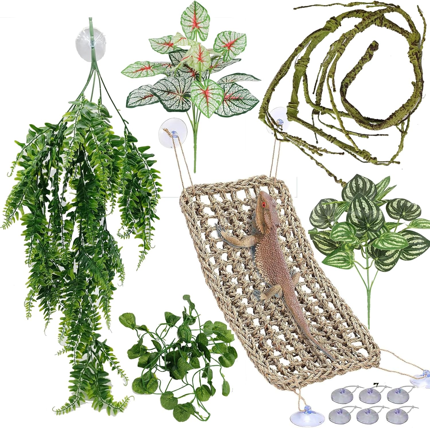 - 【Include】1 x Large Rectangle Hammock, 1 x Large Plastic Hanging Leaves vines, 2 x mini Hanging Ivy Plants of 12 inch / 31cm in length, 4 x large/strong suction cups of 2 inch / 5cm in Dia. Perfect for reptile habitat decorations, terrarium hanging, snake terrarium decorations.