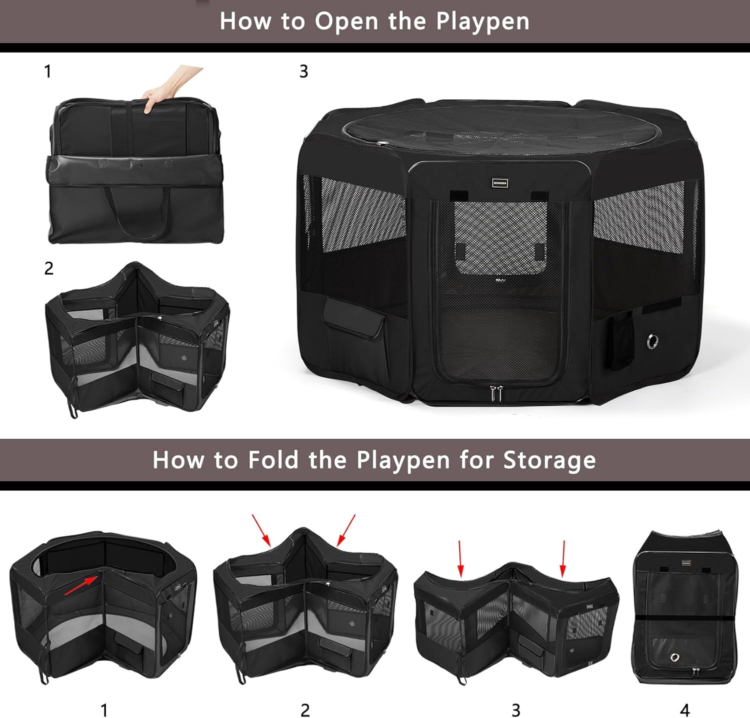 DONORO Dog Playpen Portable Pet Play Pens for Small Dog/Cat/Rabbit/Chicks, Cat Playpen Indoor/Outdoor with Carring Case, Removable Zipper Top and Bottom (Black, Small (29"x29"x15"), 8)