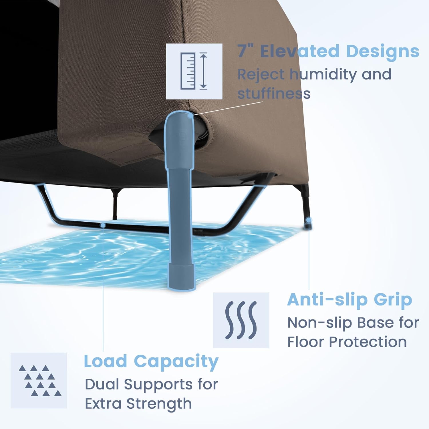 • Versatile 2-in-1 Dog House: Assembly is a breeze with no tools or screws needed – your pet will be lounging in luxury within minutes. When needed, effortlessly transform this weatherproof structure into a 2X1 Textilene elevated dog bed for easy maintenance and unparalleled comfort.