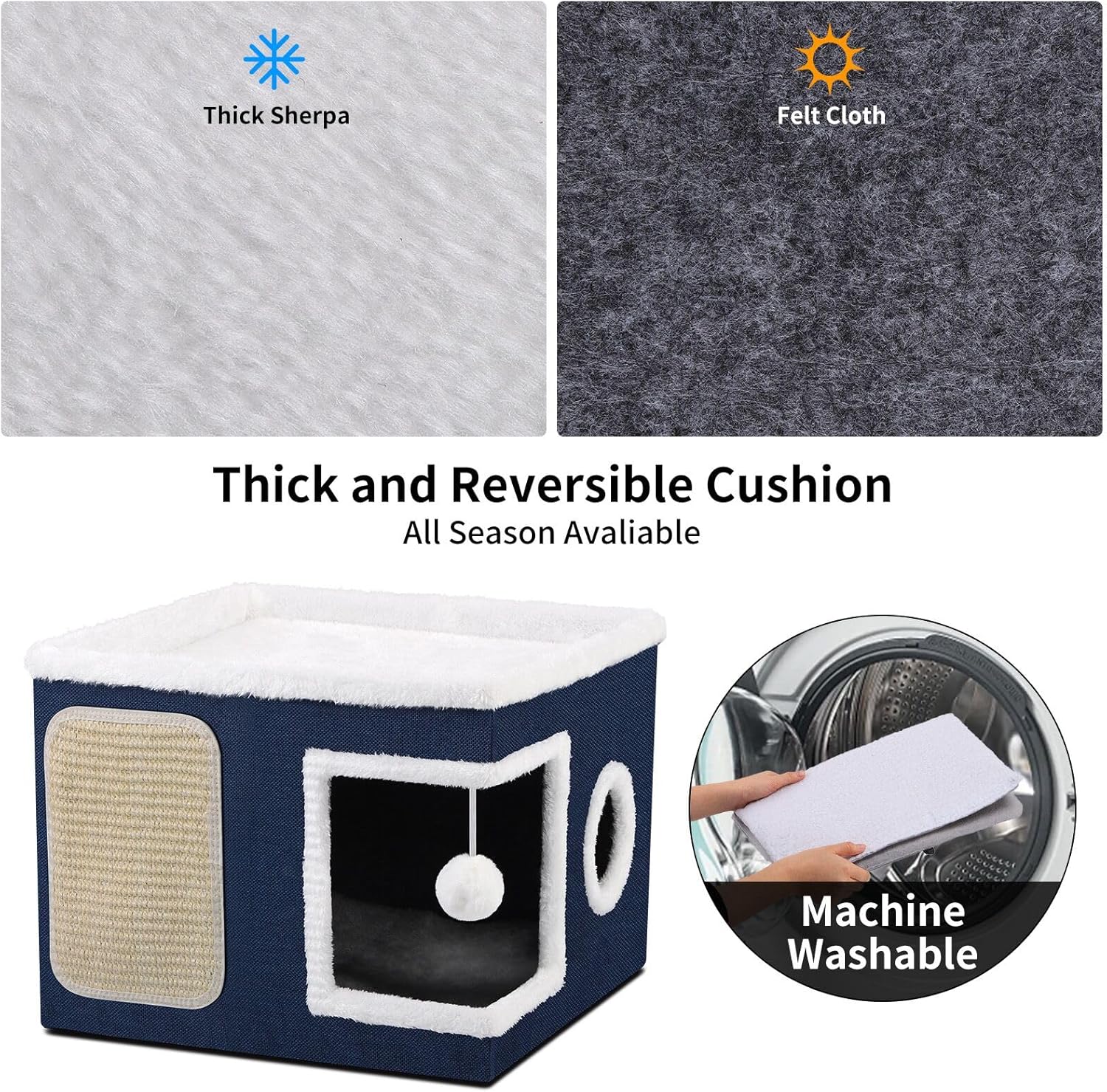 Cat House Bed for Indoor Cats, Large Cat Cave with Cozy Condo, Fluffy Hanging Ball, Scratch Pad, Hide-and-Seek, Foldable Indoor Cat House Hideaway with Double-Sided Soft Cushions for All Seasons, Blue