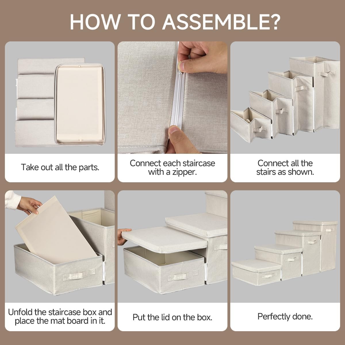 • Easy to Assemble: First, you need to attach the zipper of each step, then open each step completely, put each support board into the corresponding storage box, and finally close the lid. When not needed, remove the lid and fold it completely so you can easily move, transfer and store it. This saves space and is suitable for small rooms