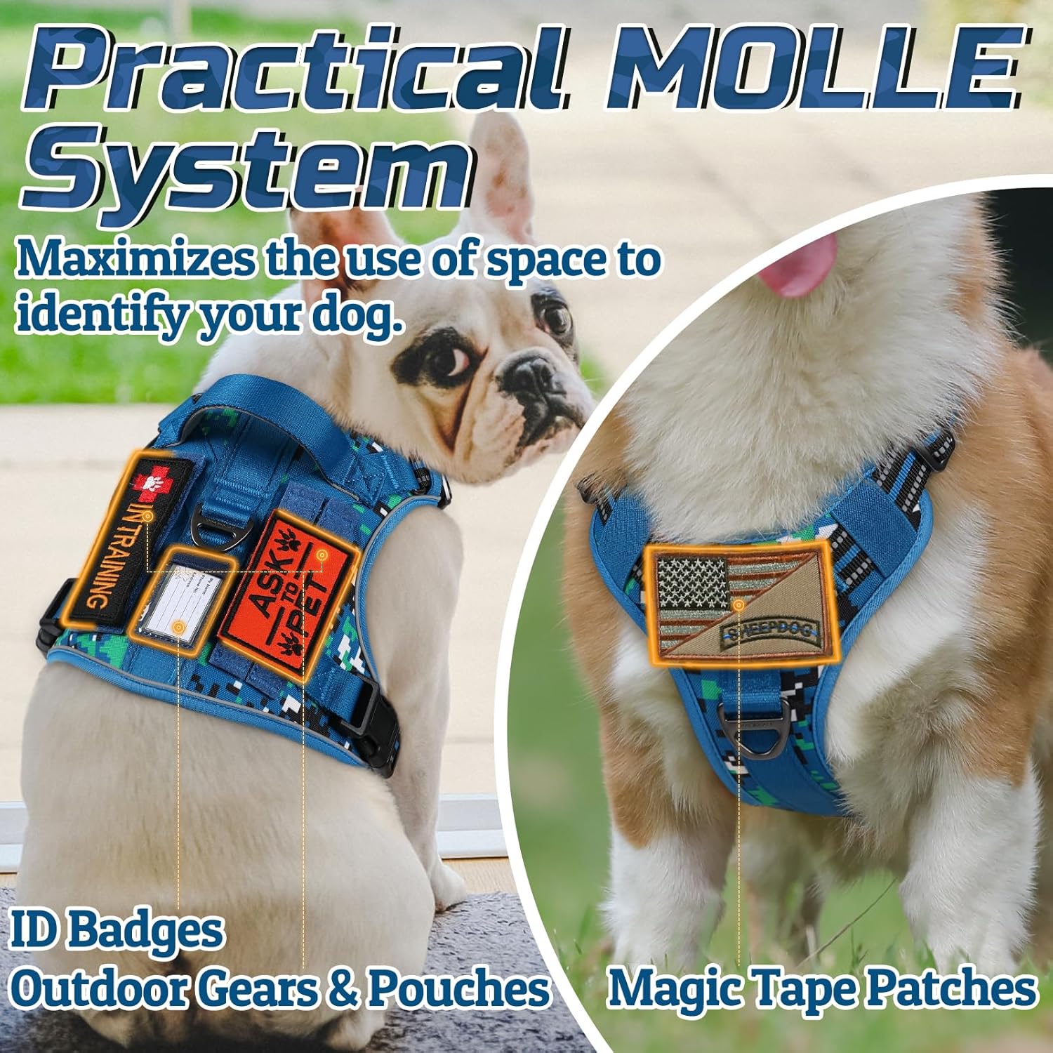 - More DIY Space: Molle system equipped on both sides of the tactical harness for pouches, water bottles and outdoor gears. You can attach personalized badges, morale patches on the hook & loop panels. Insert the ID card into the card slot to identify your dog. Widely used for personal service, law enforcement, hunting, or outdoor recreation