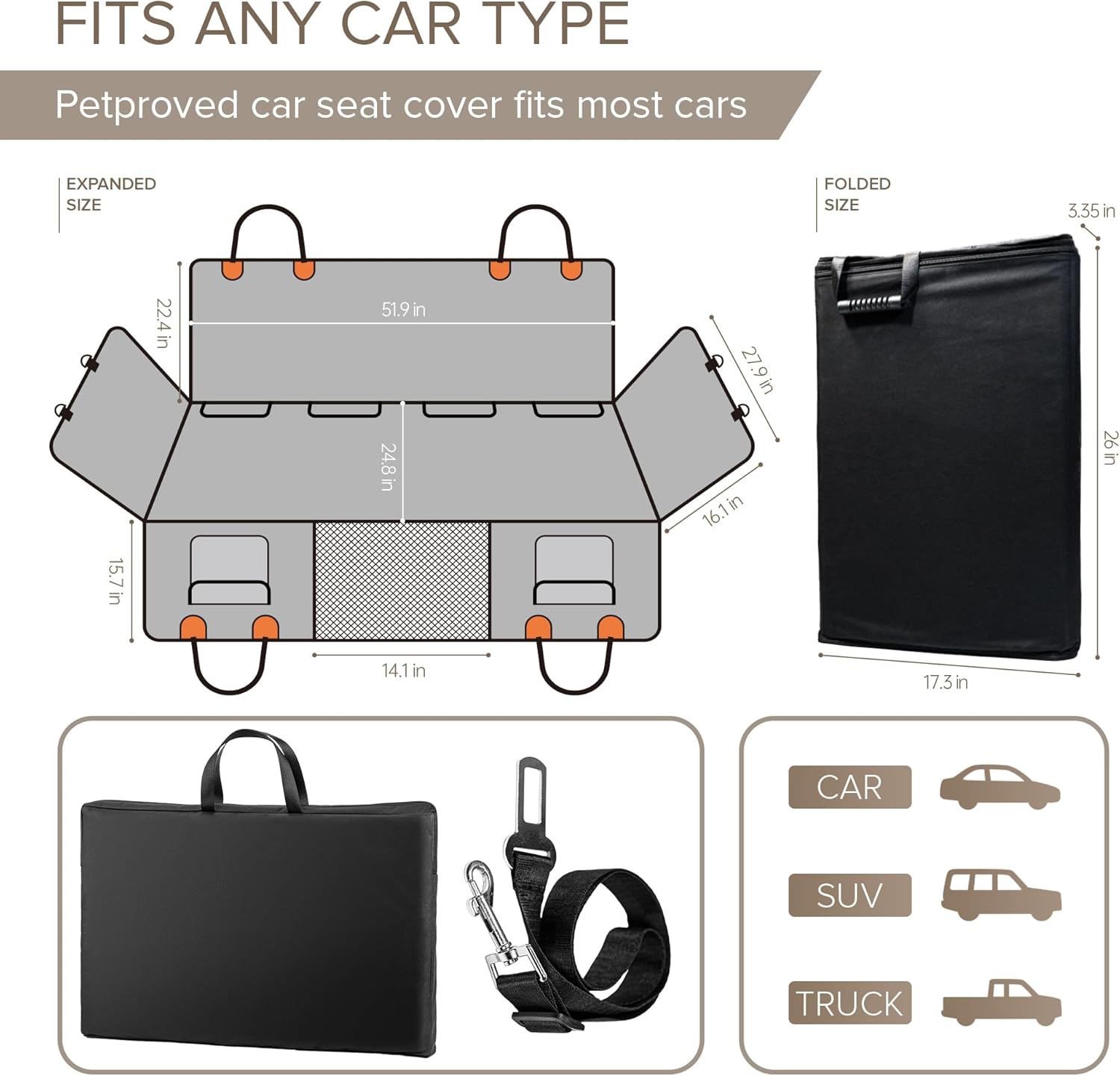 - FIT FOR ALL VEHICLE TYPES - Back seat protector for dog sized 63x52 inches that designed to effortlessly accommodate a wide range of vehicles. Whether family car, SUV, or pickup truck, this large dog car seat will fit well and provide the protection your vehicle needs. Universal rear seat cover is foldable, ensures quality and convenience, back seat extender for dogs keep car clean and secure. This pet car seat cover is perfect dog accessories and dog car seat for large dogs for all your journey