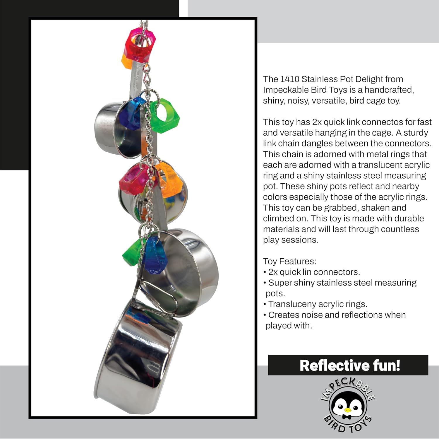 • HANDCRAFTED STAINLESS POT BIRD TOY The 1410 Stainless Pot Delight is handcrafted with a durable steel pot, shiny link chain, colorful acrylic charms, and lots of exciting textures for cage enrichment