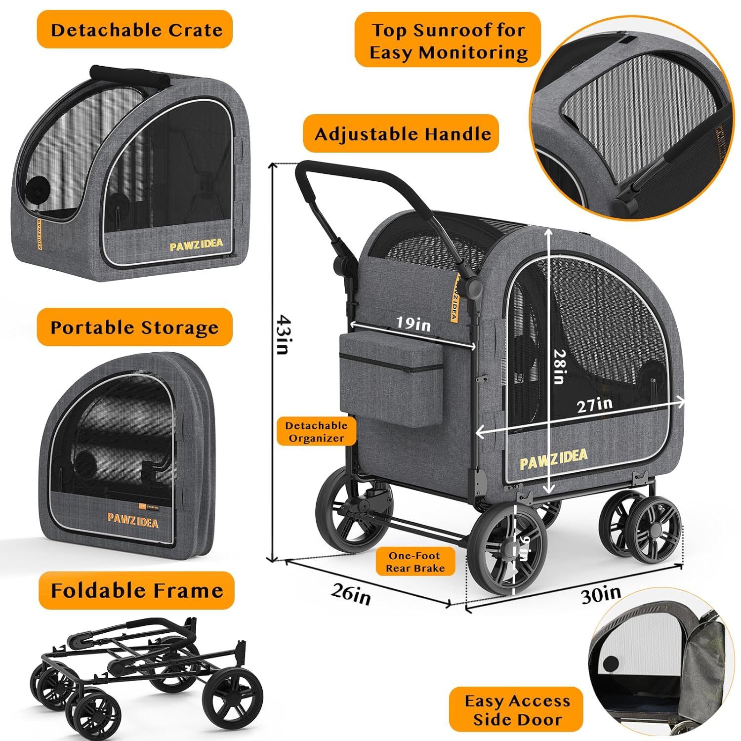 • Ample Storage & Feeding Convenience -Includes feeding windows on the side doors, dual storage pockets, and a detachable organizer bag to carry essential pet supplies. Extra large dog stroller can safely care for and take care of your pet during outdoor adventures or travel.