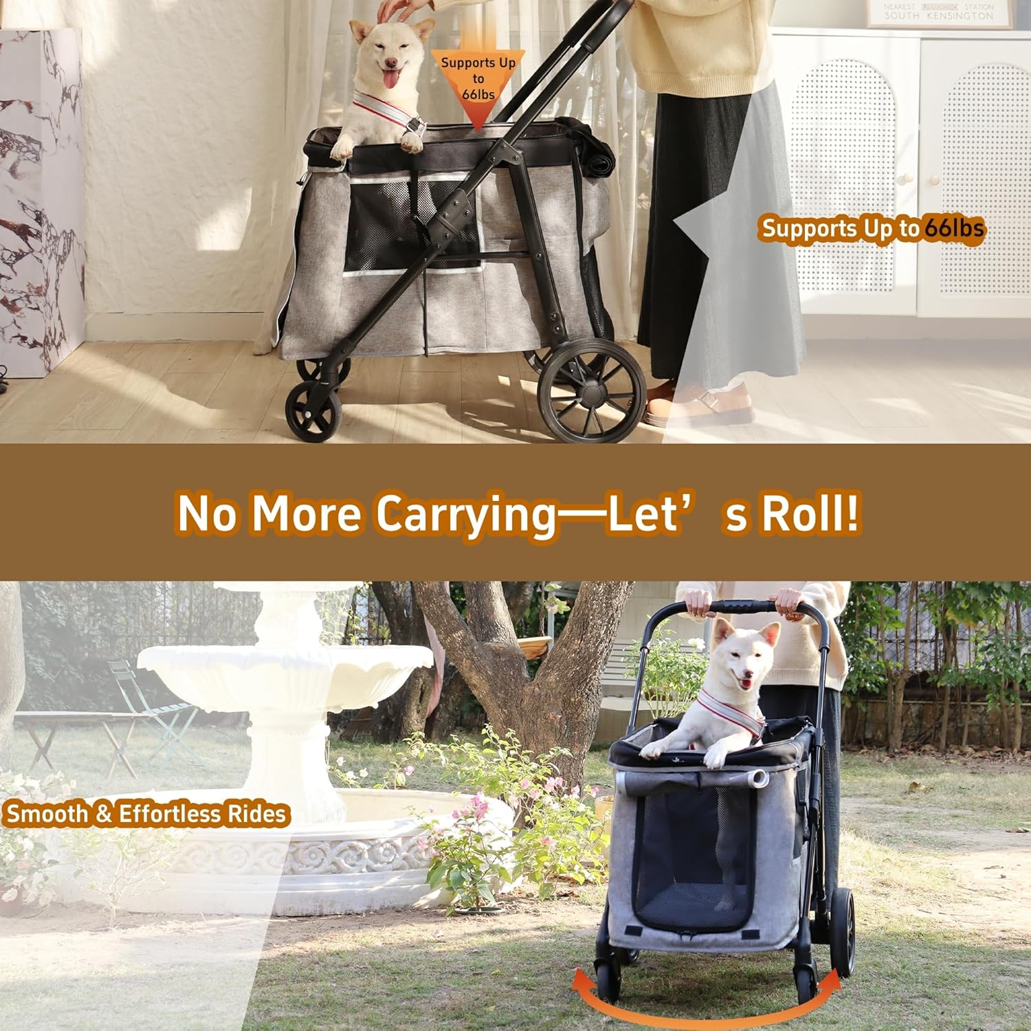 • 【Ideal for Medium to Large Pets】With an interior space of 29.5" (L) x 16.5" (W). It comfortably accommodates 4 small dogs under 15lbs, 2 medium dogs up to 30lbs, or 1 large dog up to 66lbs. The spacious design ensures your pets have plenty of room to relax, making it a versatile choice for multi-dog strollers or pet wagons for large dogs.