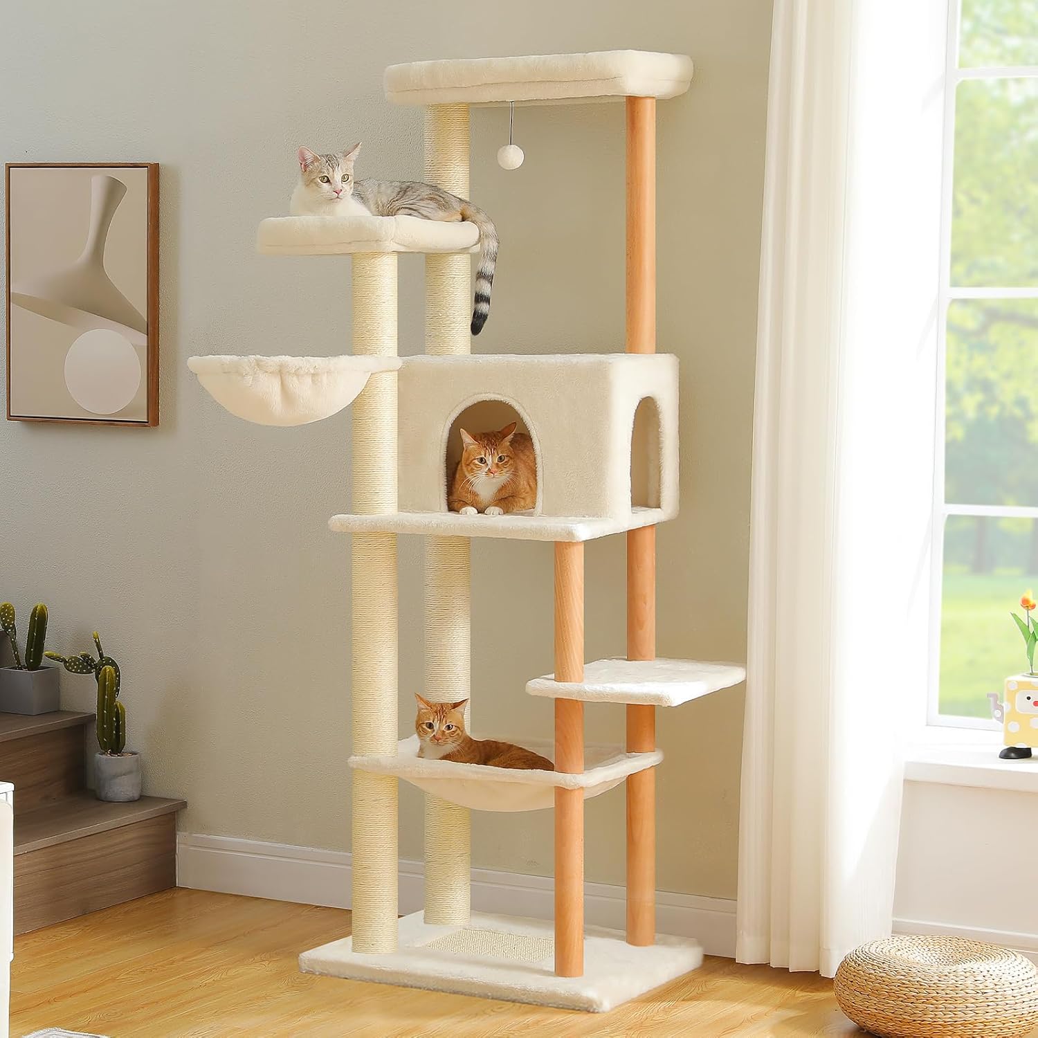 PAWZ Road Large Cat Tree, 73 Inches Tall Wooden Cat Tower with 2 Spacious Hammocks,2 Big Top Beds,8 Fully Scratching Posts and Natural Wood Posts, Multi Cat Tree for Indoor Cats Large Adult-XL