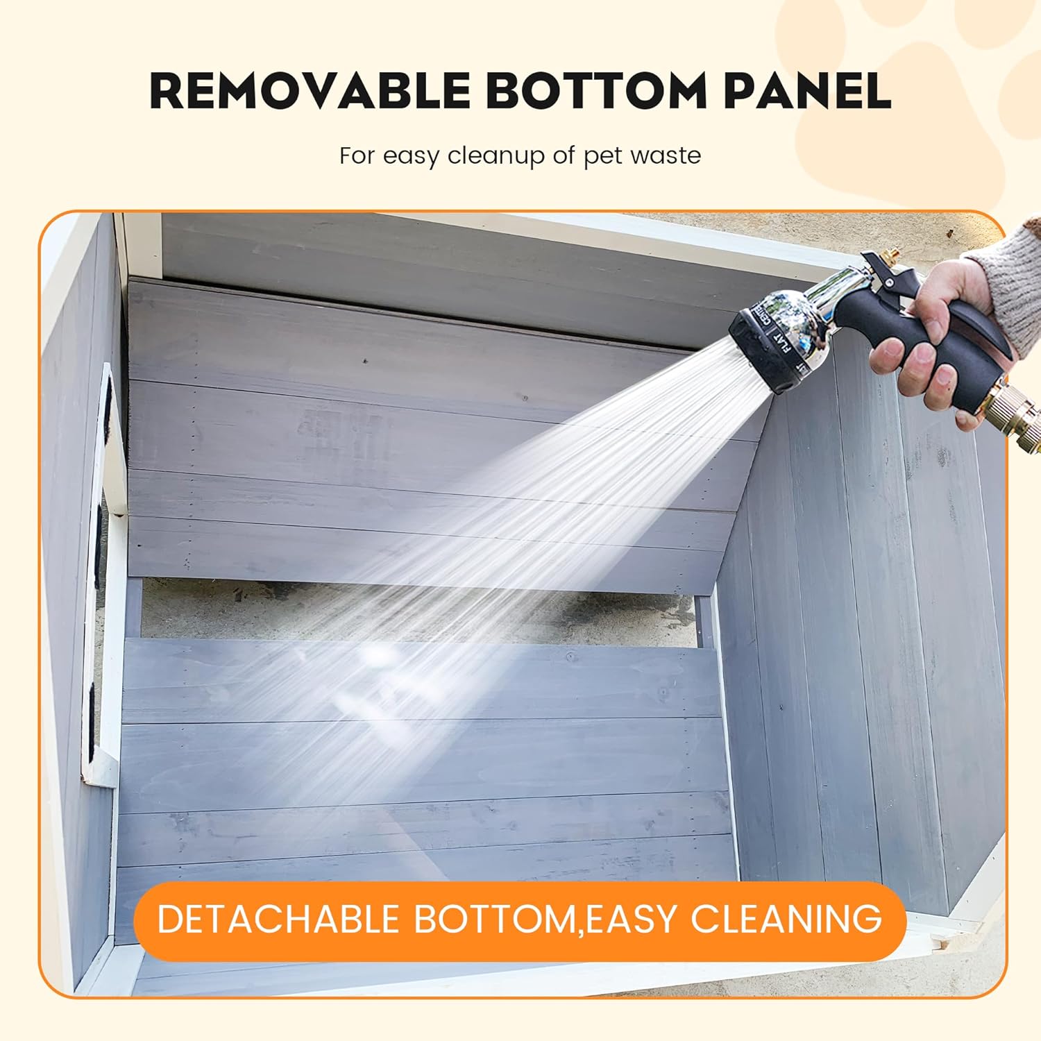 • [Specially Designed for Outdoor Use] The sloping asphalt roof is expertly engineered to prevent rainwater from pooling, ensuring that your pet's living space remains dry and comfortable. The floor is 2.4’’ above the ground, and there is a removable PVC curtain and adaptable floor pads for uneven ground. This design enables the dog house to withstand harsh weather conditions, preventing water from seeping in and materials from getting damp