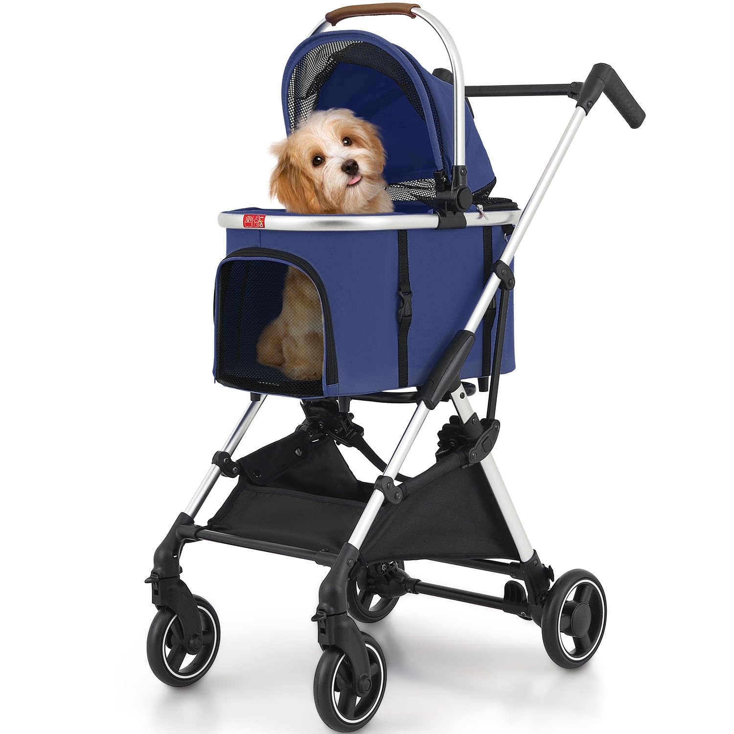 • [Built for You and Your Pet] - Simple to assemble, generously sized for various pets, and offers great value with high-quality construction. It features smooth foldability, excellent maneuverability, and a stylish color. The wheels glide effortlessly over rough terrain, and its durable design is ideal for daily use. Cup holders fit bottles comfortably, and the storage basket is easy to access.