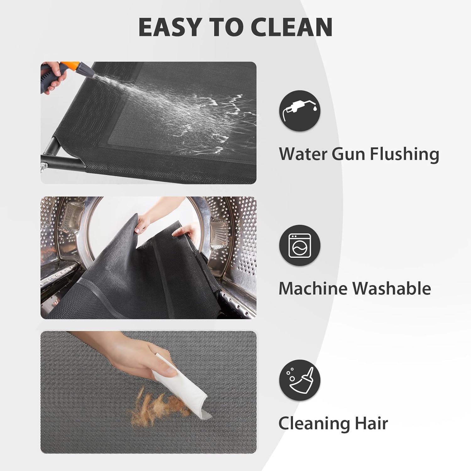 - 【DOG BED EASY CARE】: This cooling elevated dog bed is super easy to clean. Pet hair, vomit, and dust can be quickly wiped away, or you can wash the mesh with tap water, a hose, or a damp towel. For a deeper clean, use mild soap or natural cleaning agents. No more worries about pet odors, dirt, or excessive hair. (Note: Wash the U-shaped pillow separately with pet shampoo.)