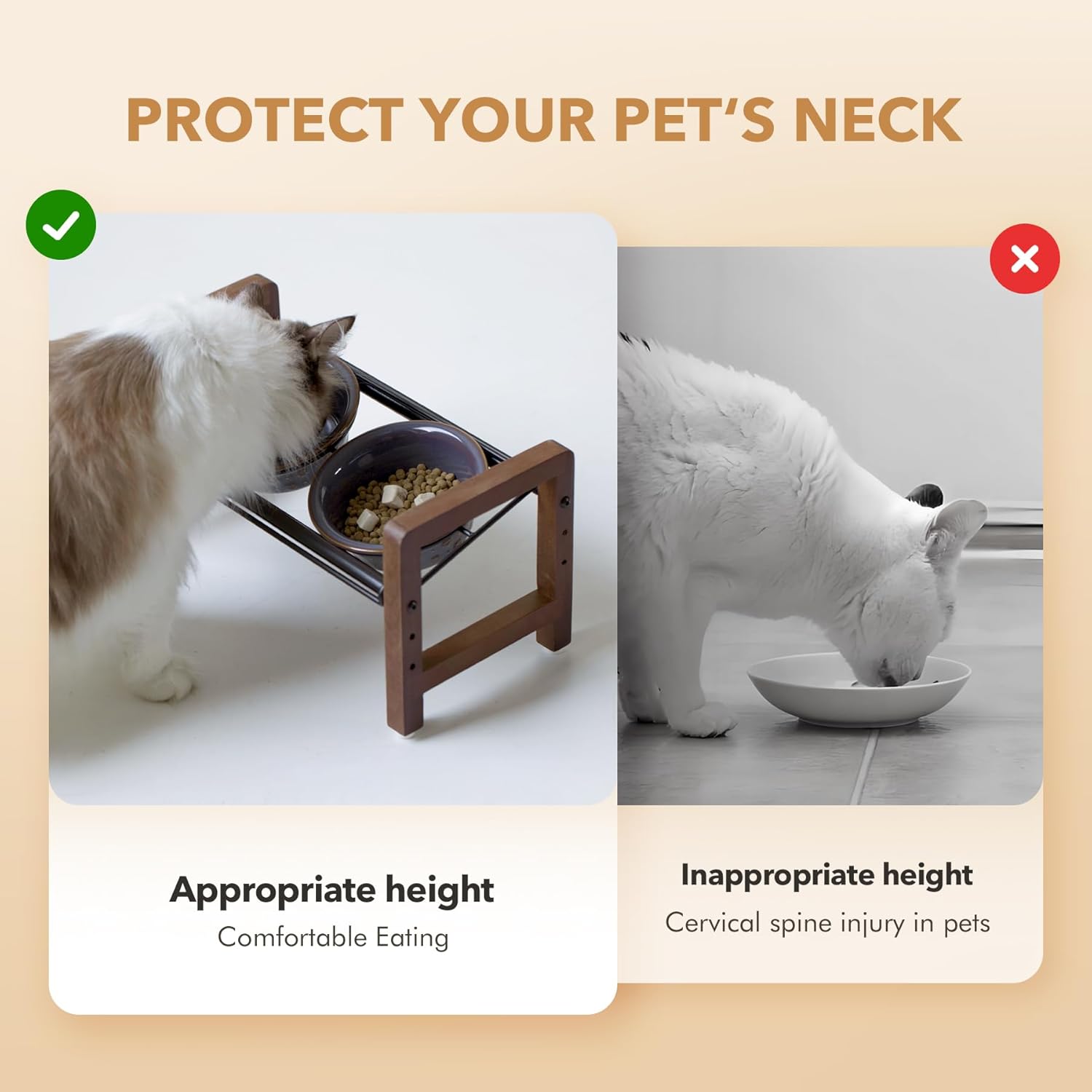 • 3 Adjustable Heights & 2 Placement Options: This stand offers 3 adjustable heights, ranging from 5.5 inches to 8.7 inches, catering to the needs of pets at different growth stages. The circular metal component on top of the stand features two distinct placement options, allowing the bowls to be either horizontally aligned or tilted. Our products are designed to help protect the pet's cervical spine and meet their diverse needs.